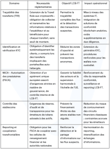 L’année 2025 marque une évolution majeure du cadre réglementaire européen applicable aux cryptoactifs. Deux textes clés, le règlement MiCA (Markets in Crypto-Assets Regulation) et le règlement TFR (Transfer of Funds Regulation, dit « Travel Rule »), redéfinissent la conformité LCB-FT des prestataires du secteur. Ces mesures s’inscrivent dans la volonté de renforcer la transparence, la traçabilité des flux et la supervision des acteurs opérant sur les marchés des cryptoactifs, jugés à risque élevé de blanchiment et de financement du terrorisme par le COLB et le GAFI.